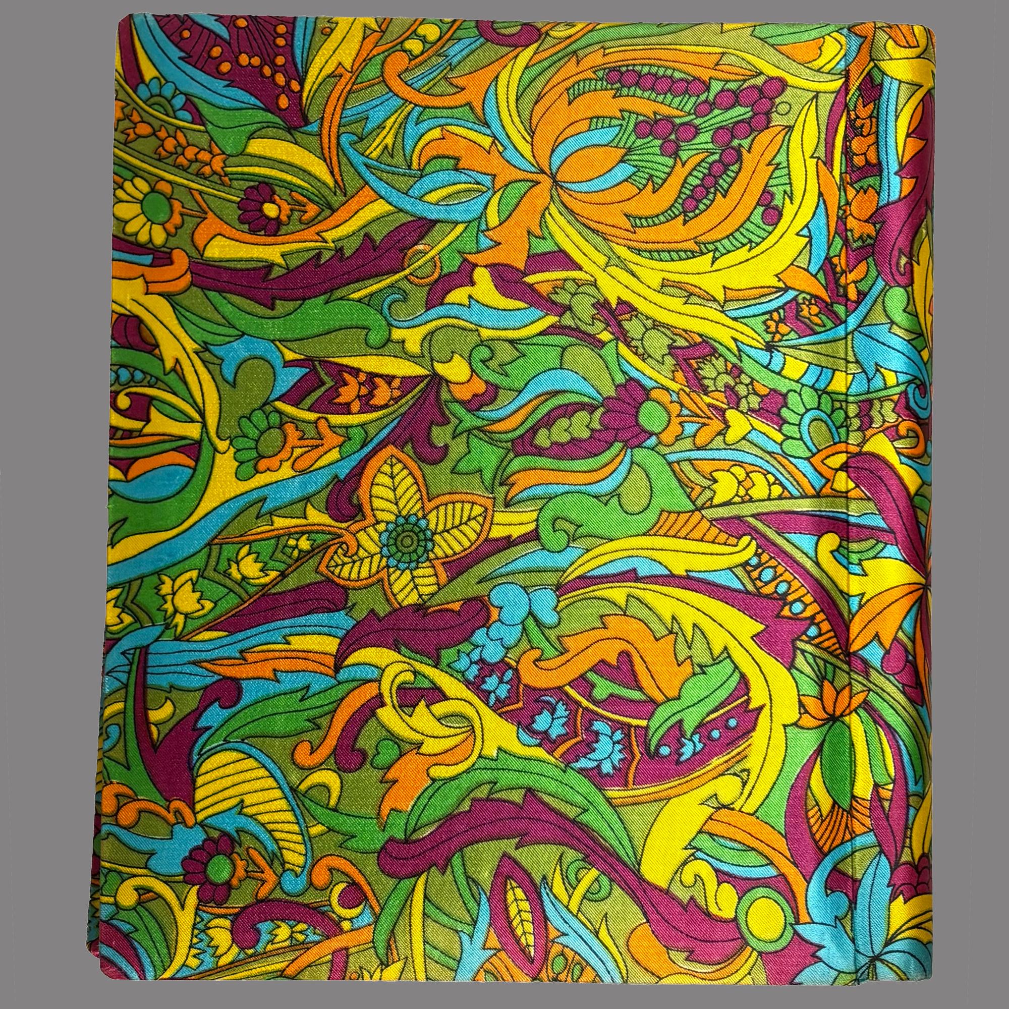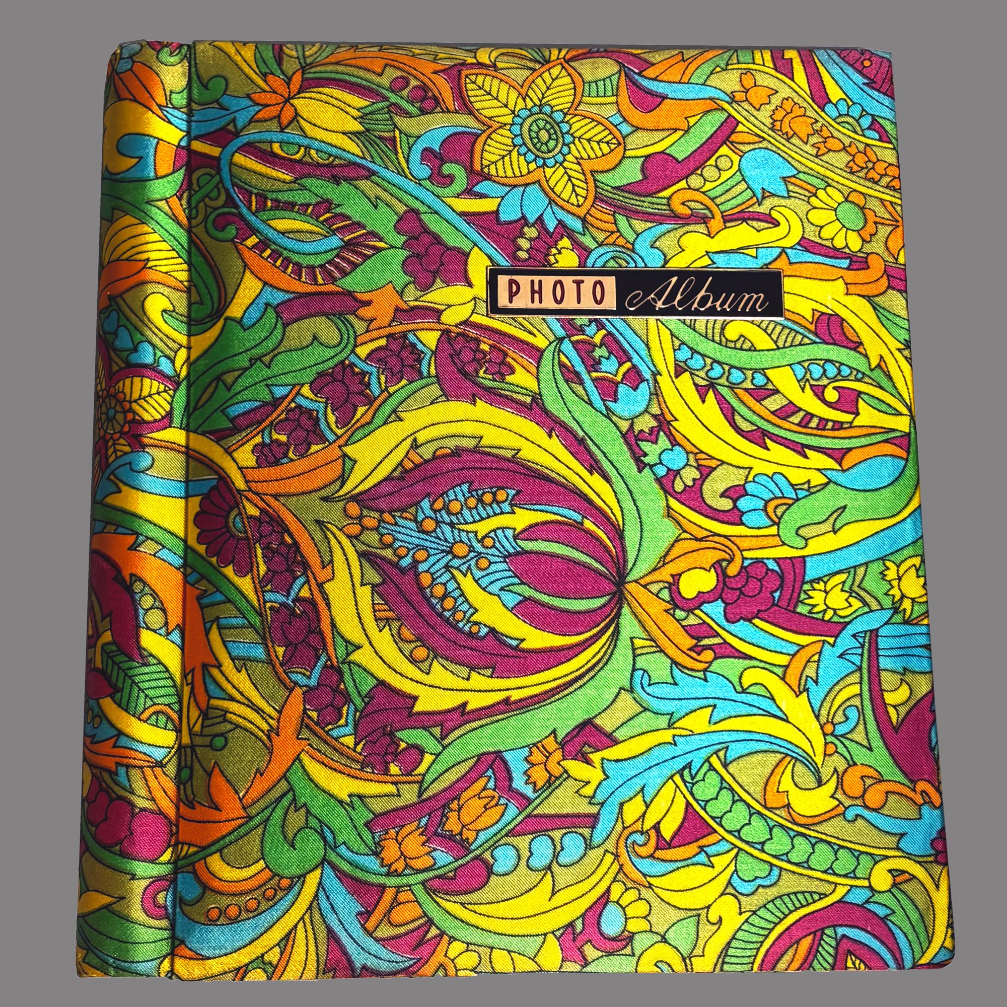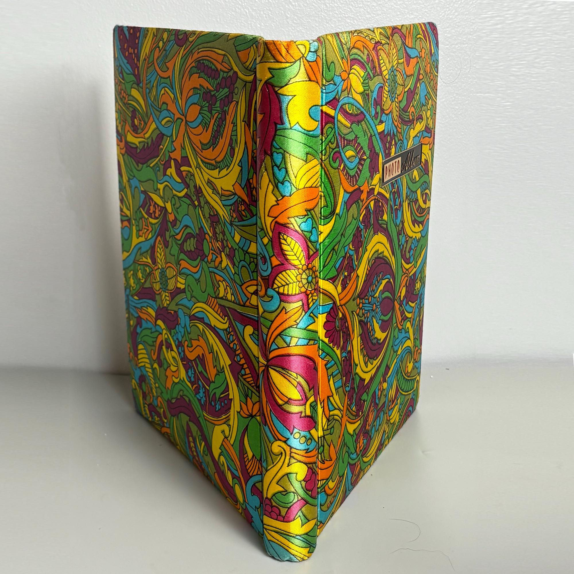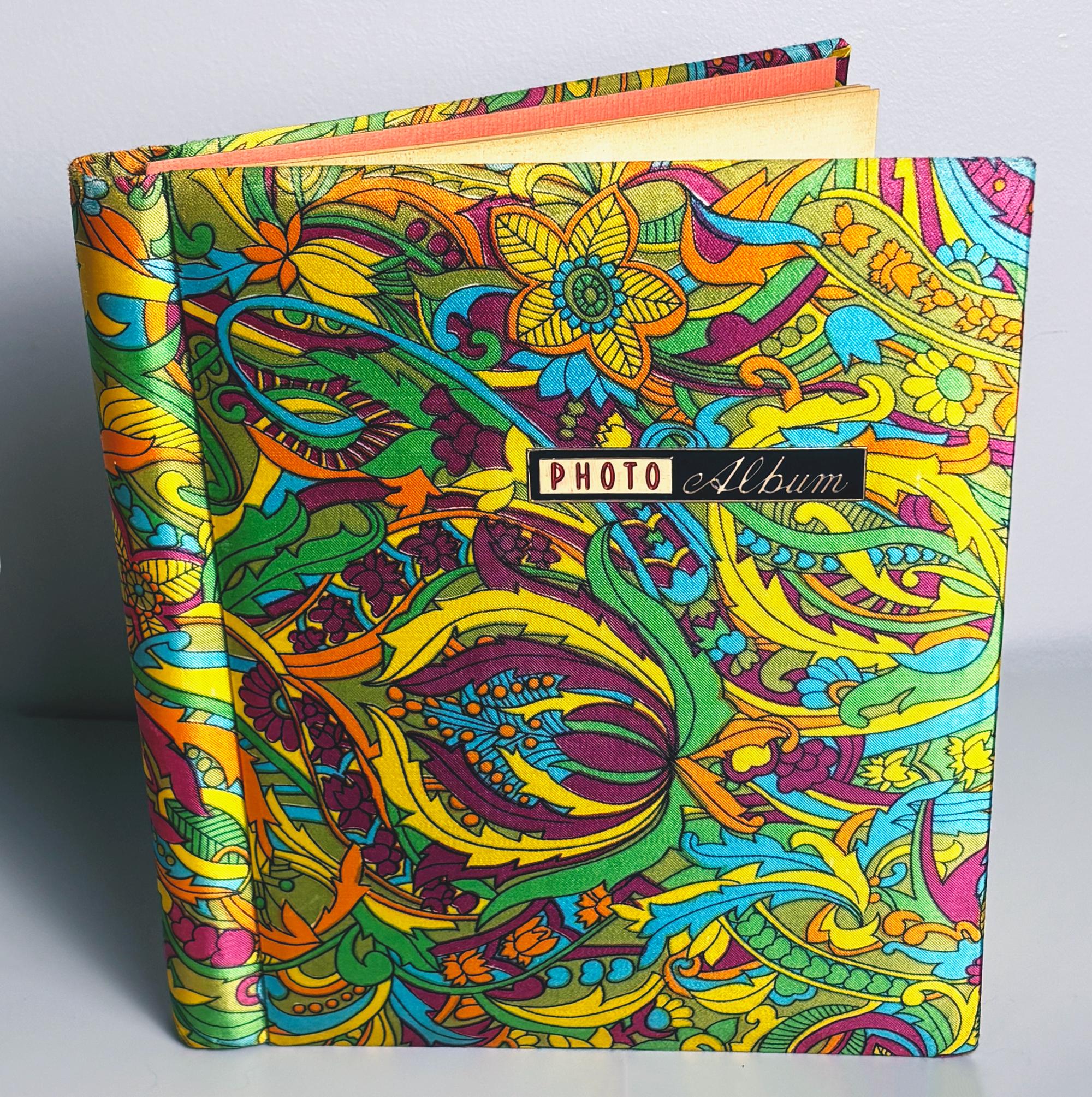 Colorful vintage 1970s MCM sateen psychedelic fabric covered Photo Album, printed and made in Japan.