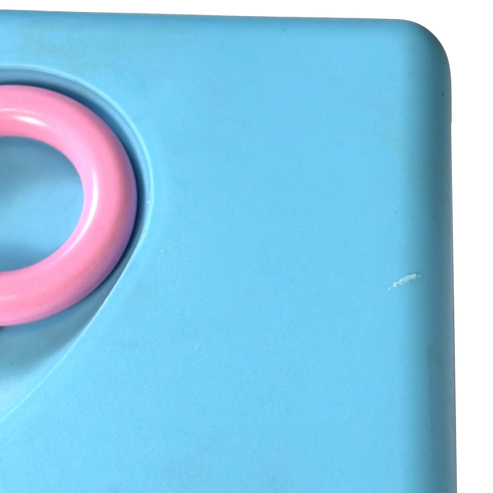 Pink and teal. Measures about 10.15" x 7.5" x 4.5" overall. Two slide out top trays, one divided horizontally, the other vertically.