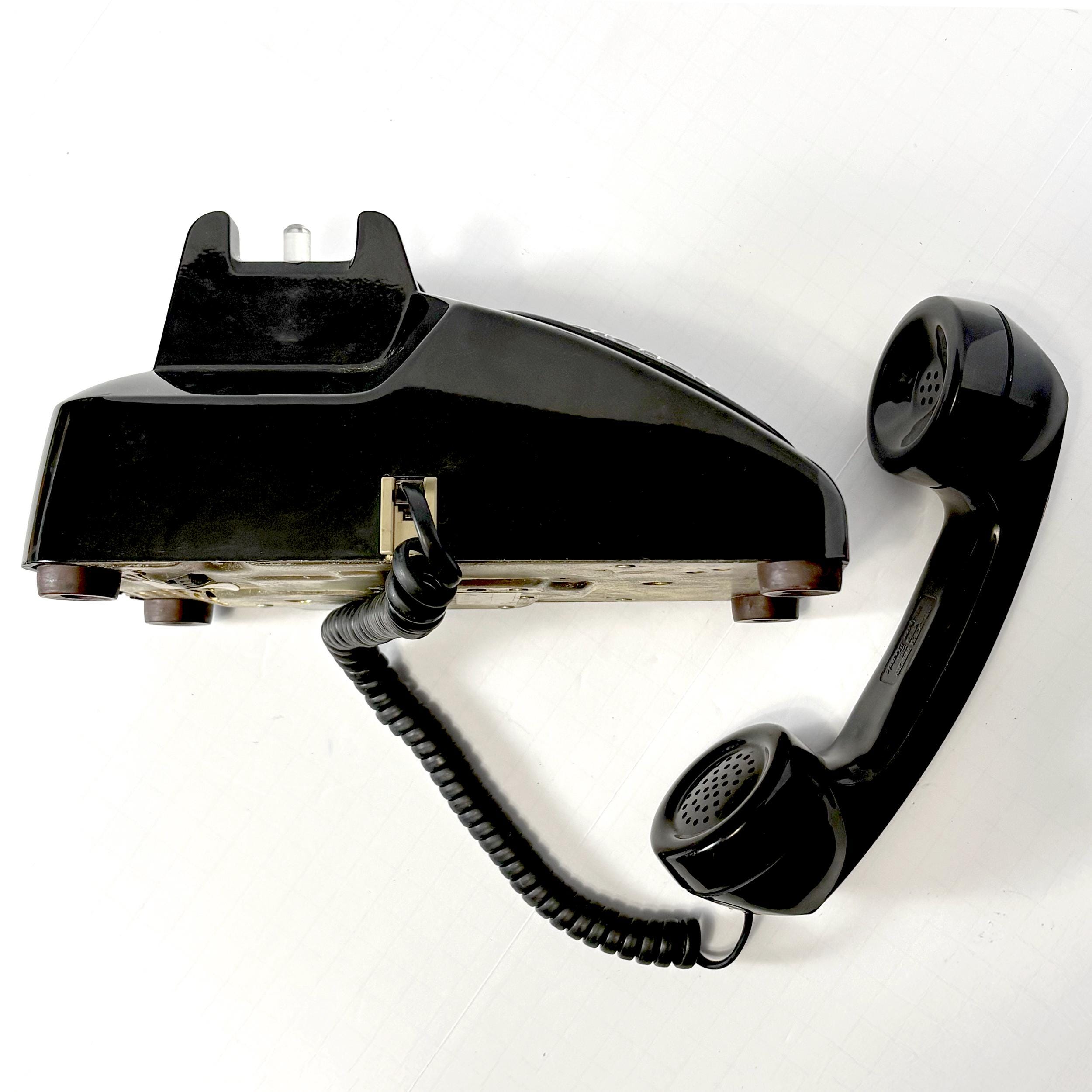 Issued before 911 was implemented in the area, the top of the handset has an applied panel featuring the local numbers for emergency services as well as the local funeral home which provided it. Early 911 sticker applied beneath the receiver.