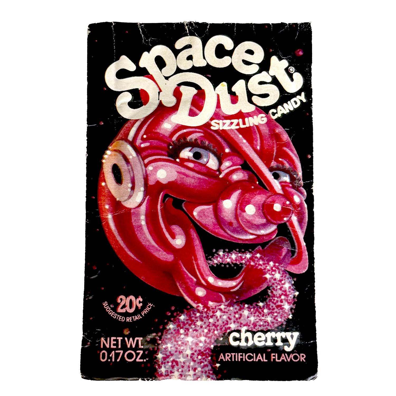 Rare unopened 0.17oz packet of Space Dust sizzling candy from the 1970s. Iconic pop art illustrated 20¢ Cosmic Cherry packaging.