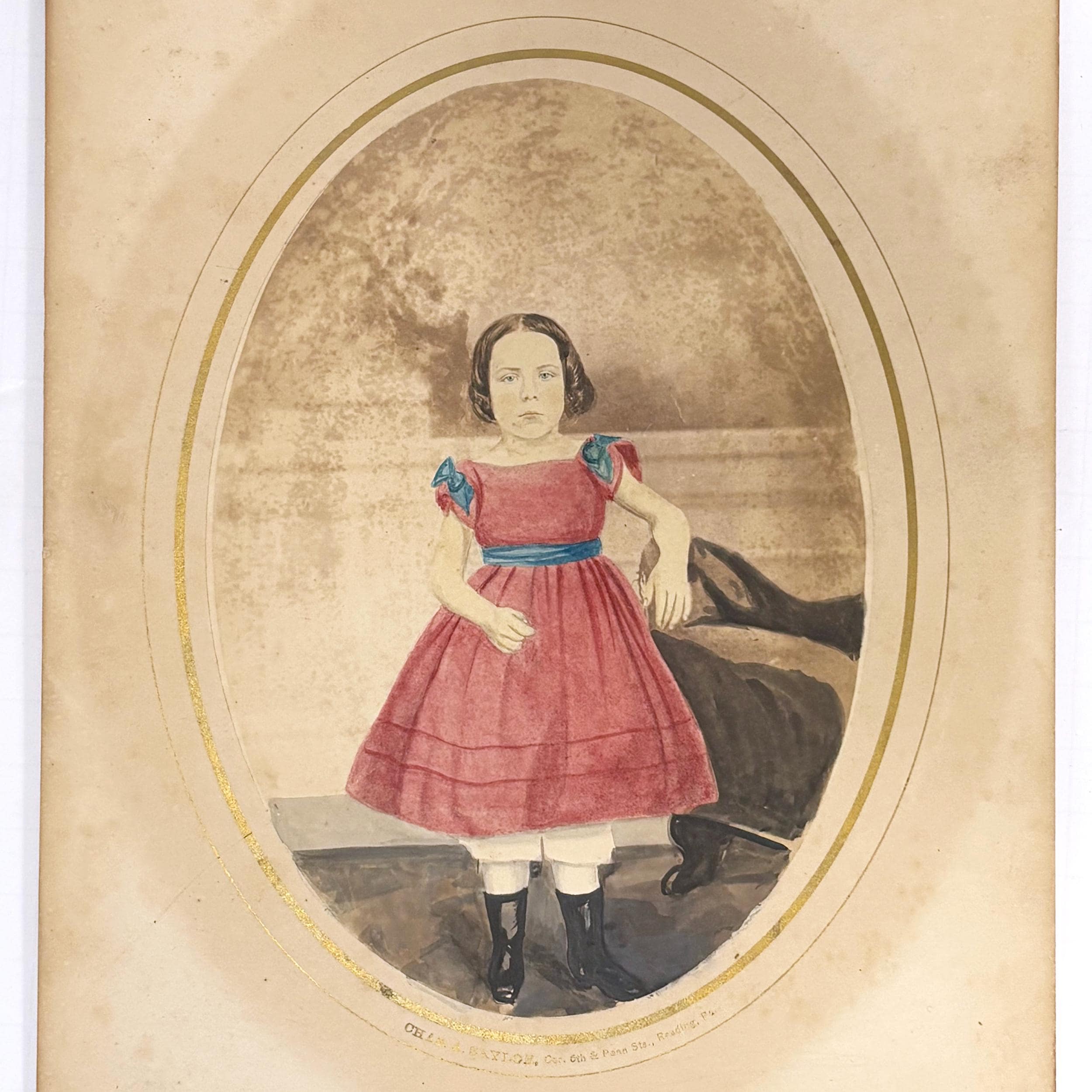 Large original victorian cabinet photo of a young woman in a watercolor tinted & hand-painted pink dress with blue trim circa 1880s, Chas A. Saylor – Reading, PA