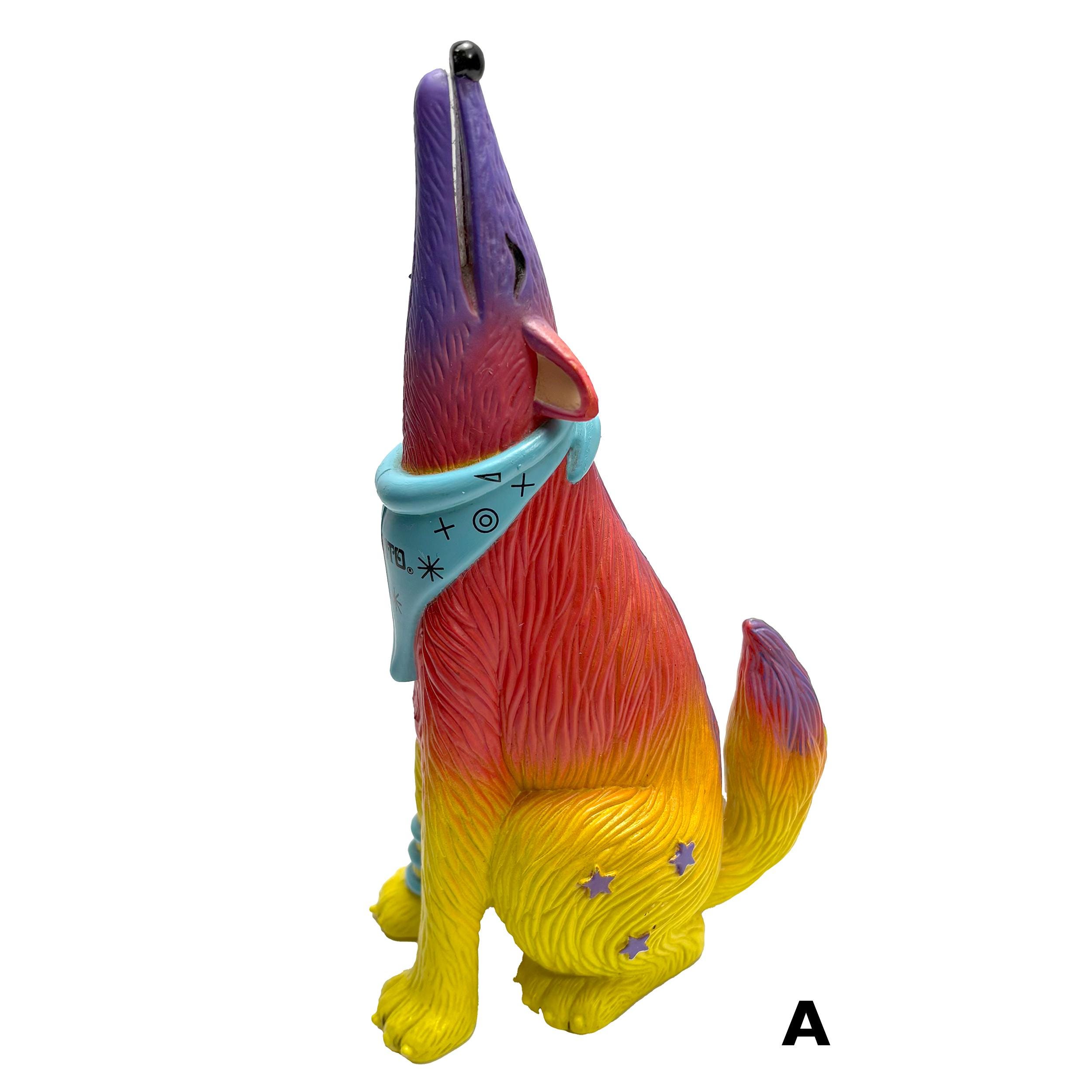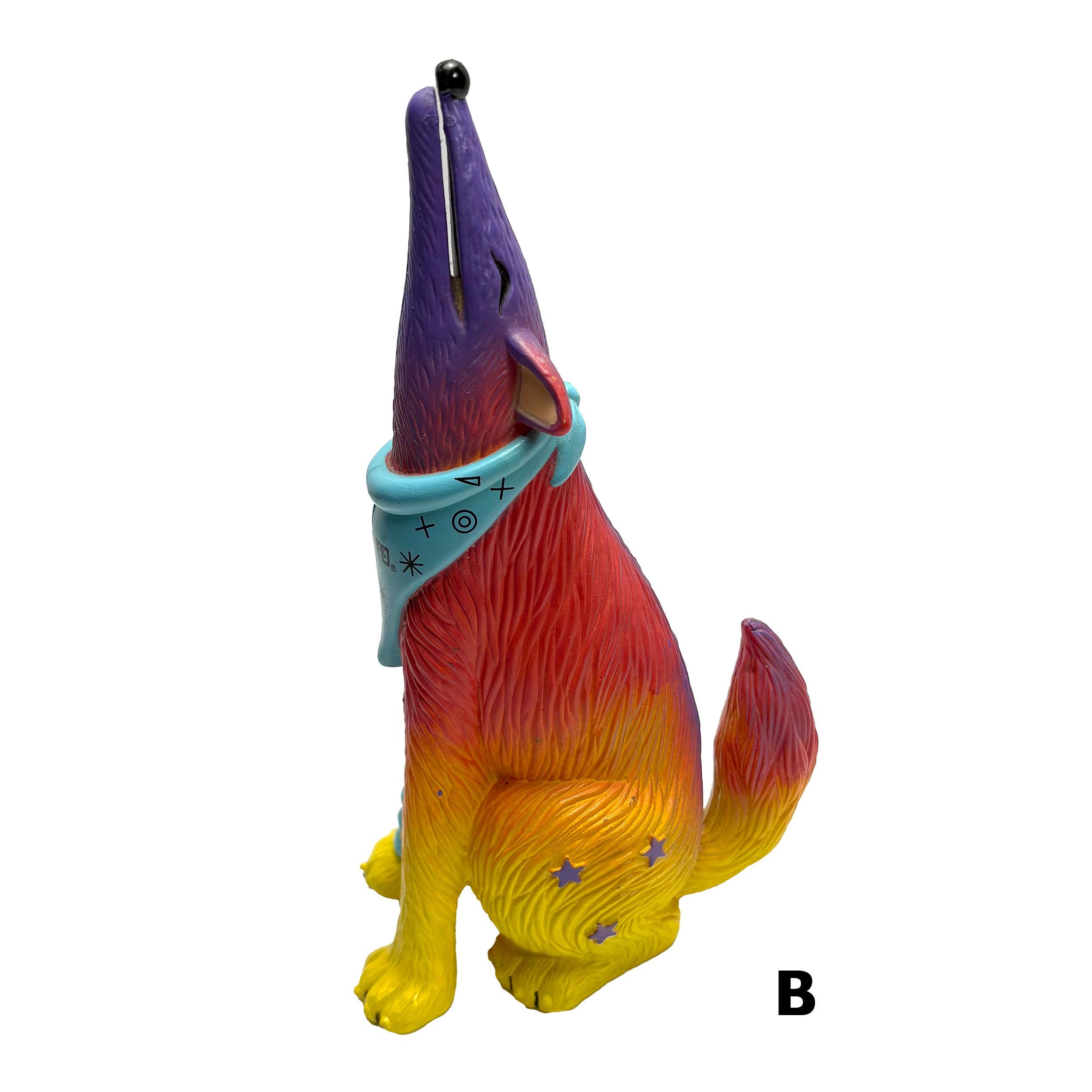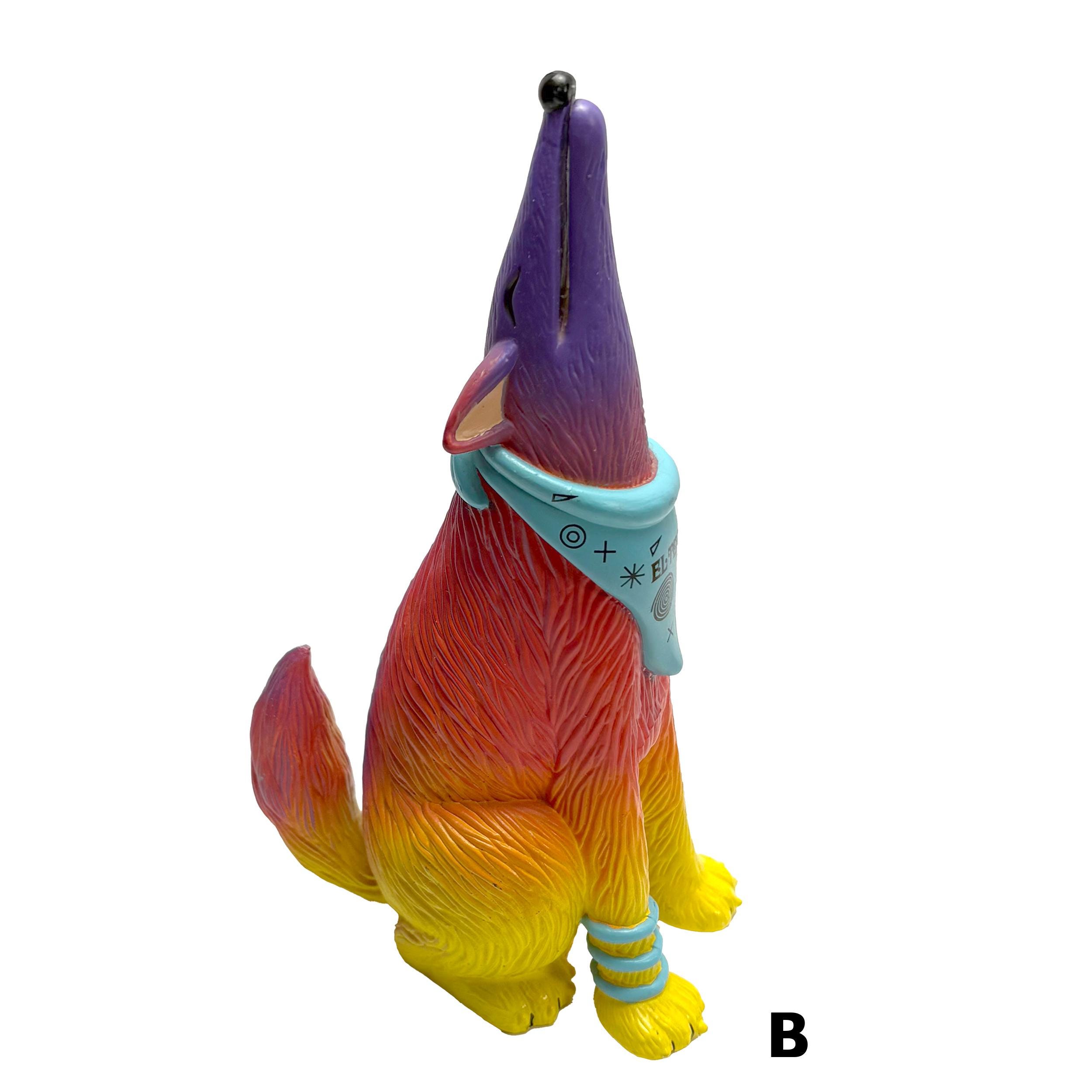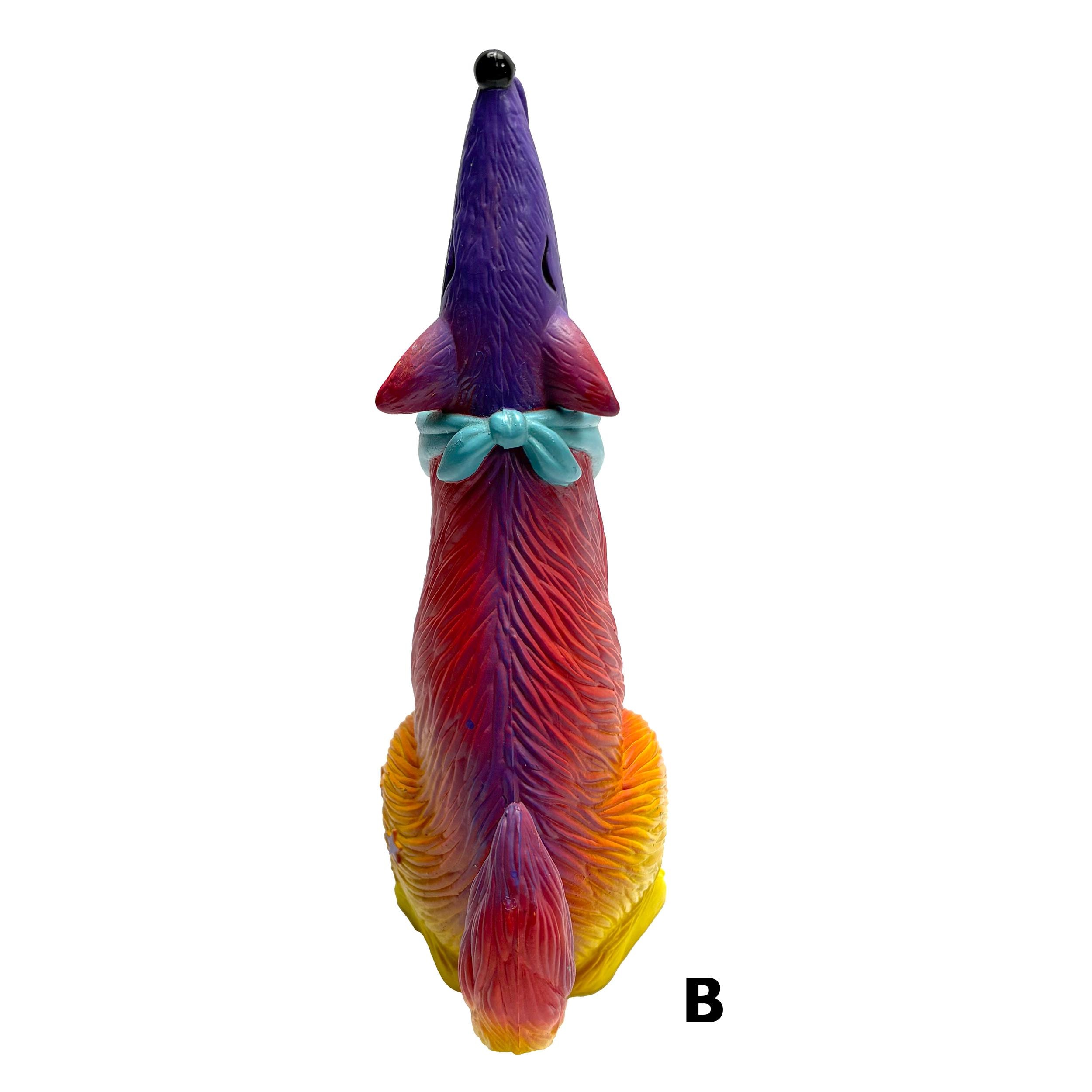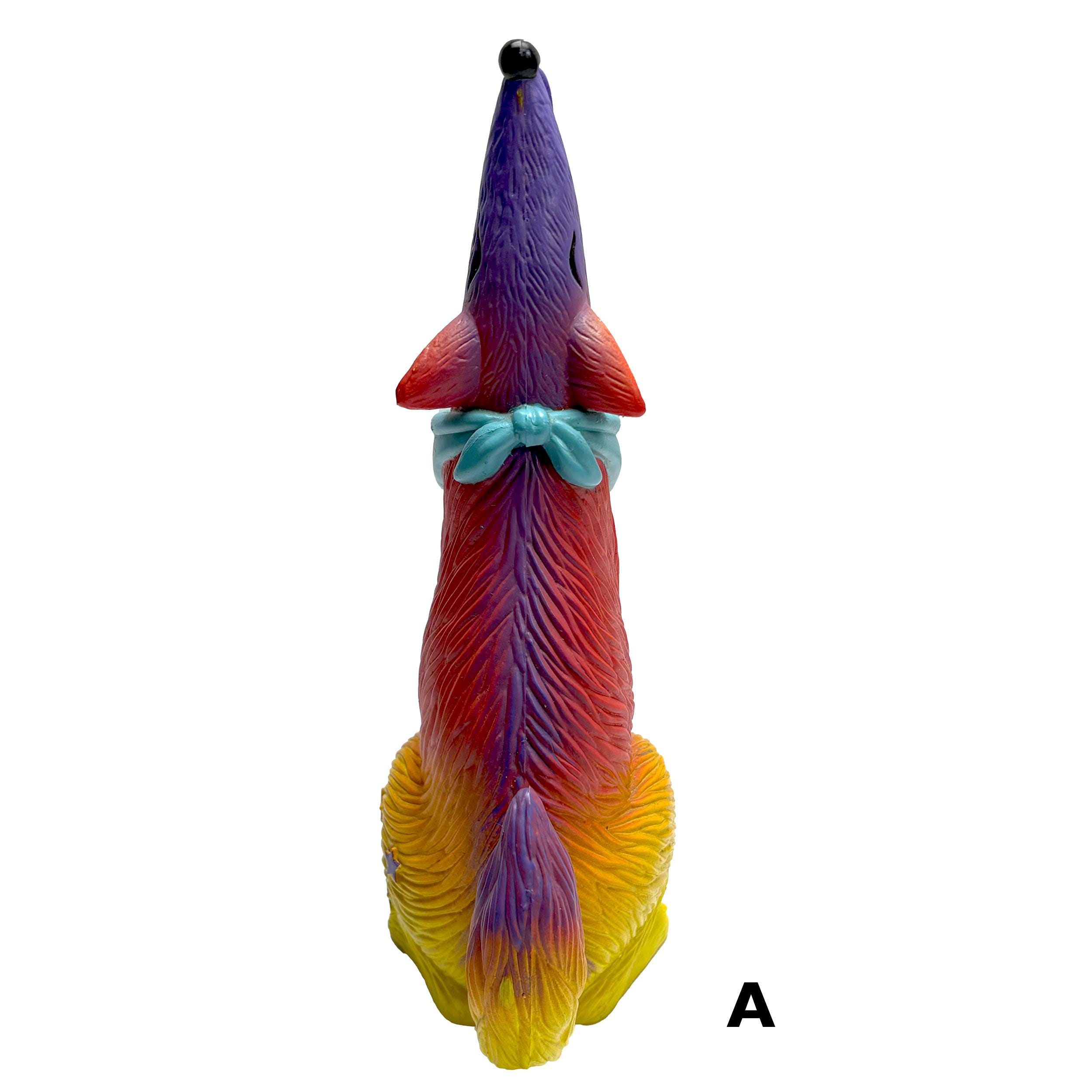 Hard vinyl in southwestern rainbow colors. Stands 7.25" tall, 2.5" wide and 4" deep.