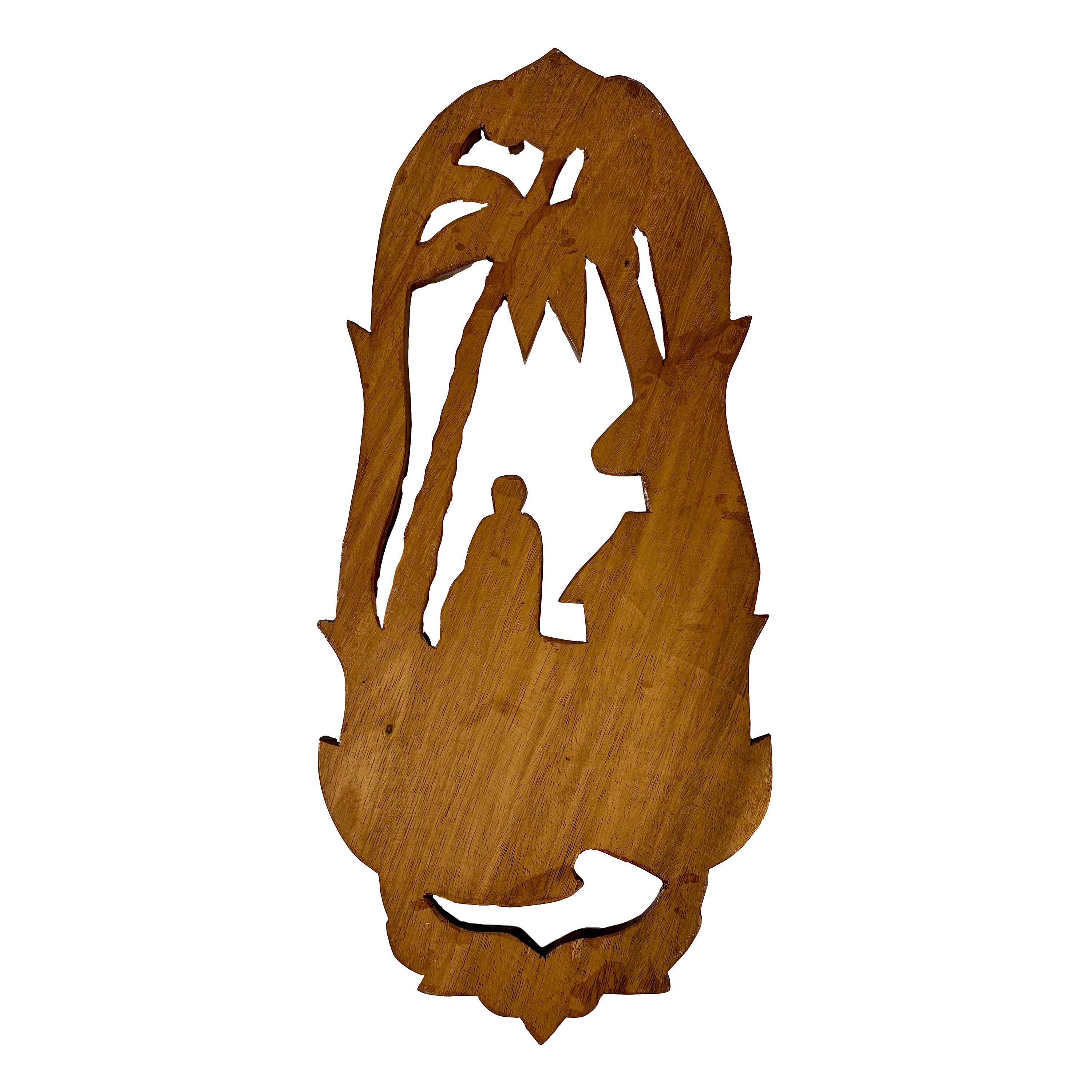 Hand-carved lightweight wood, possibly monkeypod. Measures 22" tall, 10" wide and about .75" deep.
