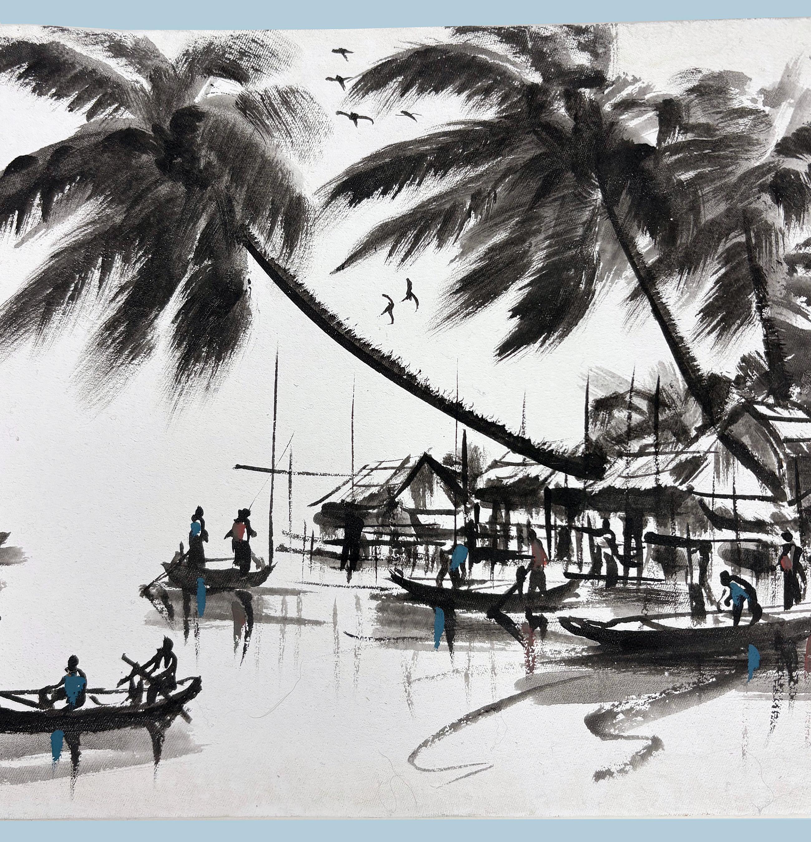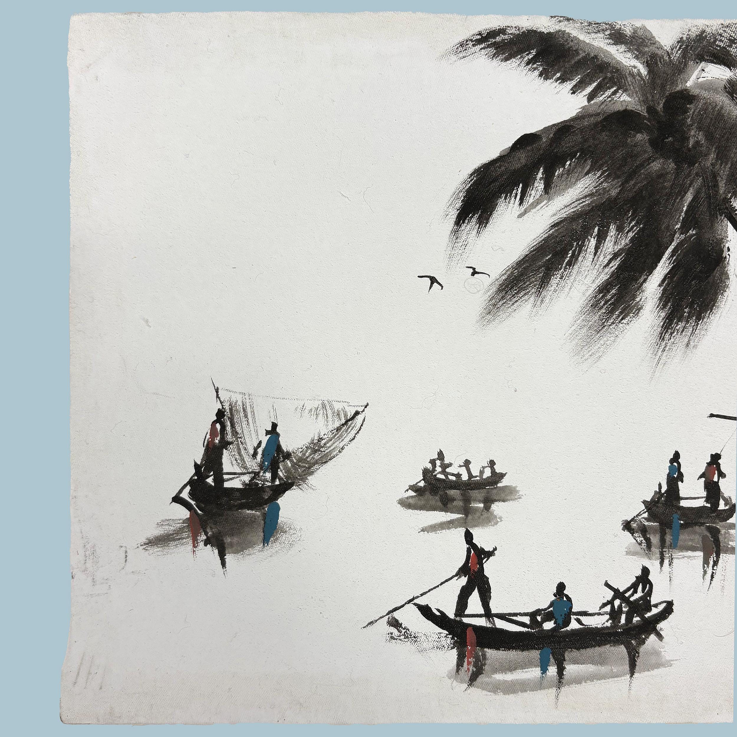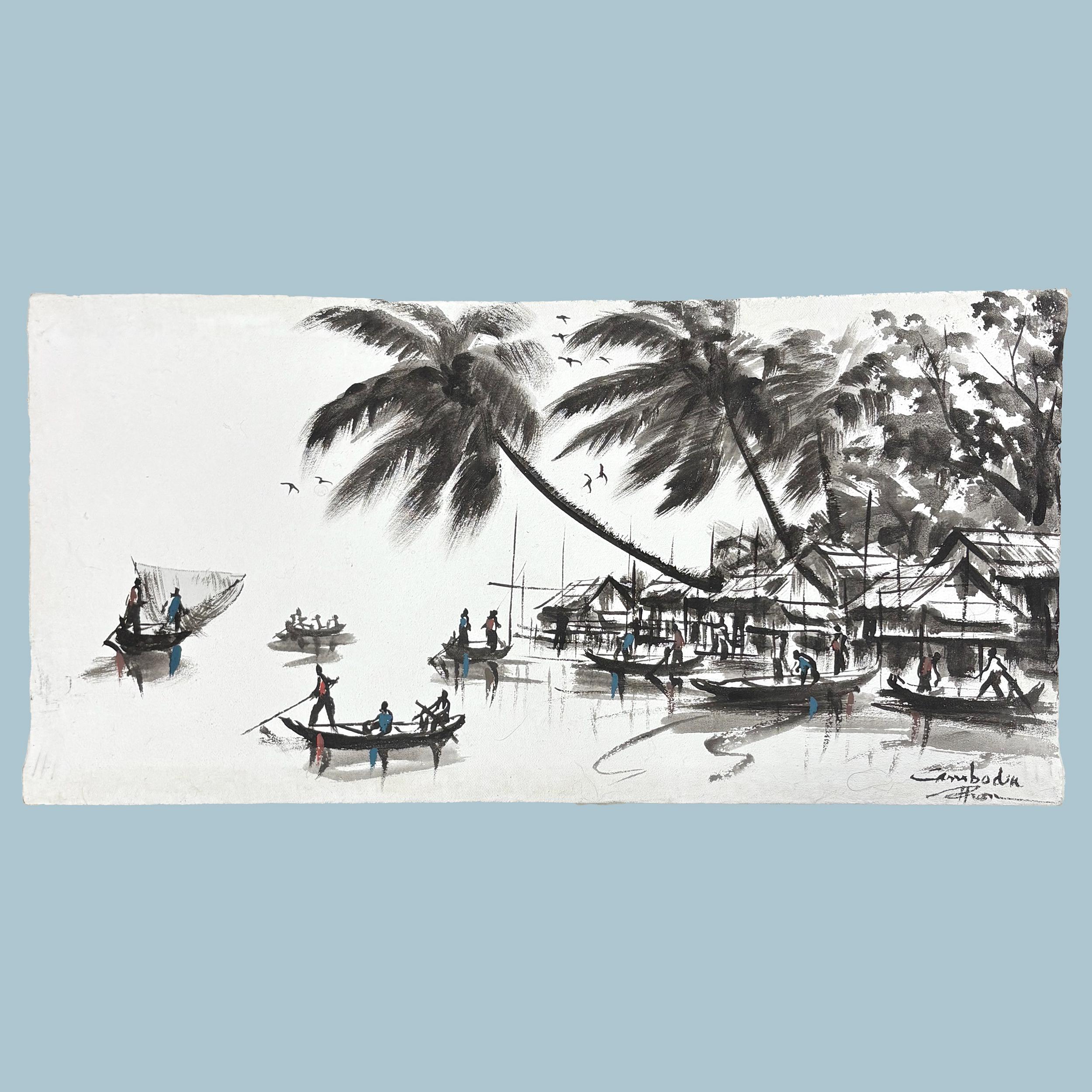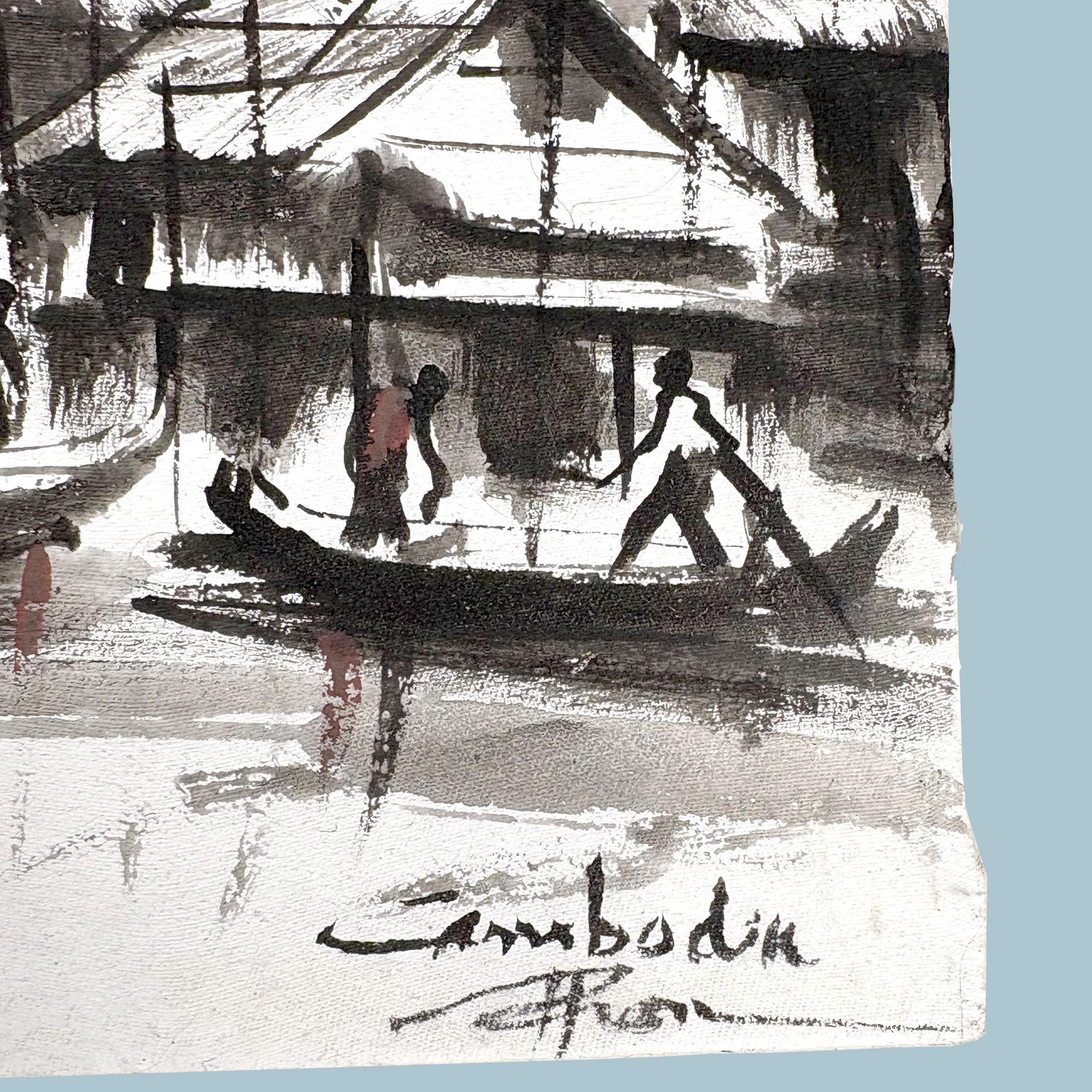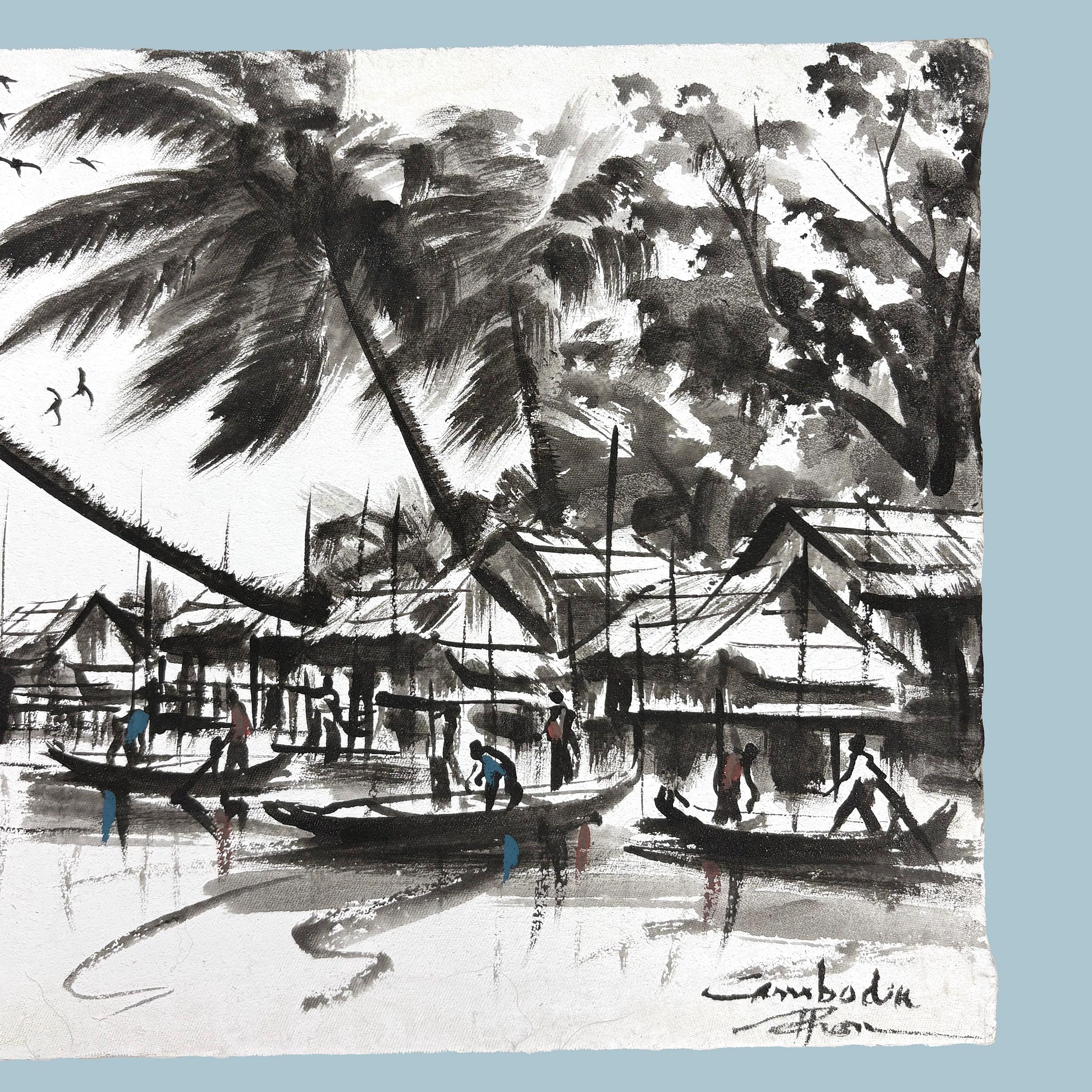 Masterful signed original ink wash folk art painting of a Cambodian floating village.