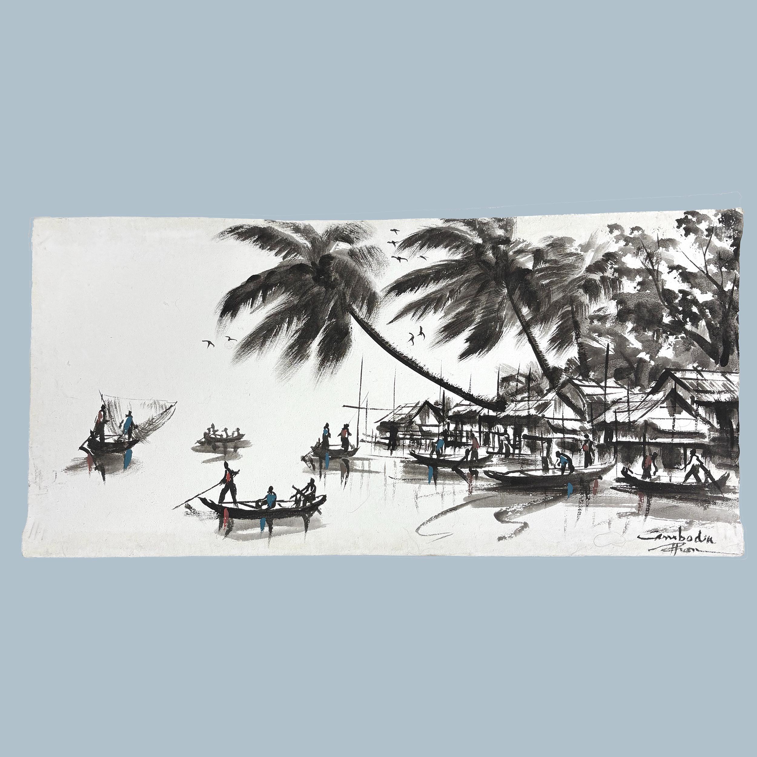 Cambodian Floating Village Original Signed Ink Wash Painting, 40x20cm