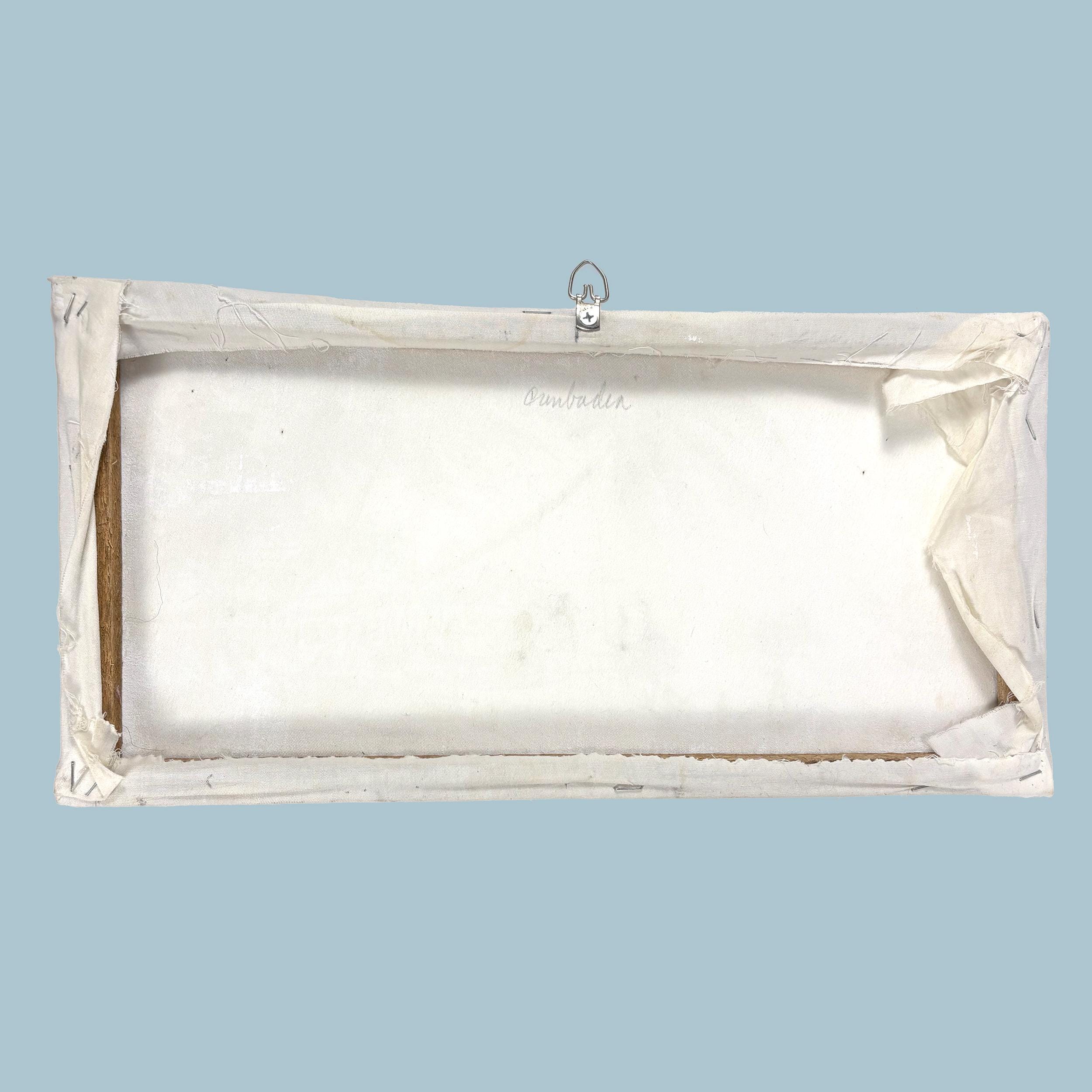 Measures 40cm x 20cm and 1.5cm deep (about 15.75" x 7.9" x 0.6") overall. Non-standard, roughtly hand-stretched canvas. Top and bottom bracers are 40cm across, right bracer is 20cm while left bracer is 19.5cm, measures about 39.5cm at center.
