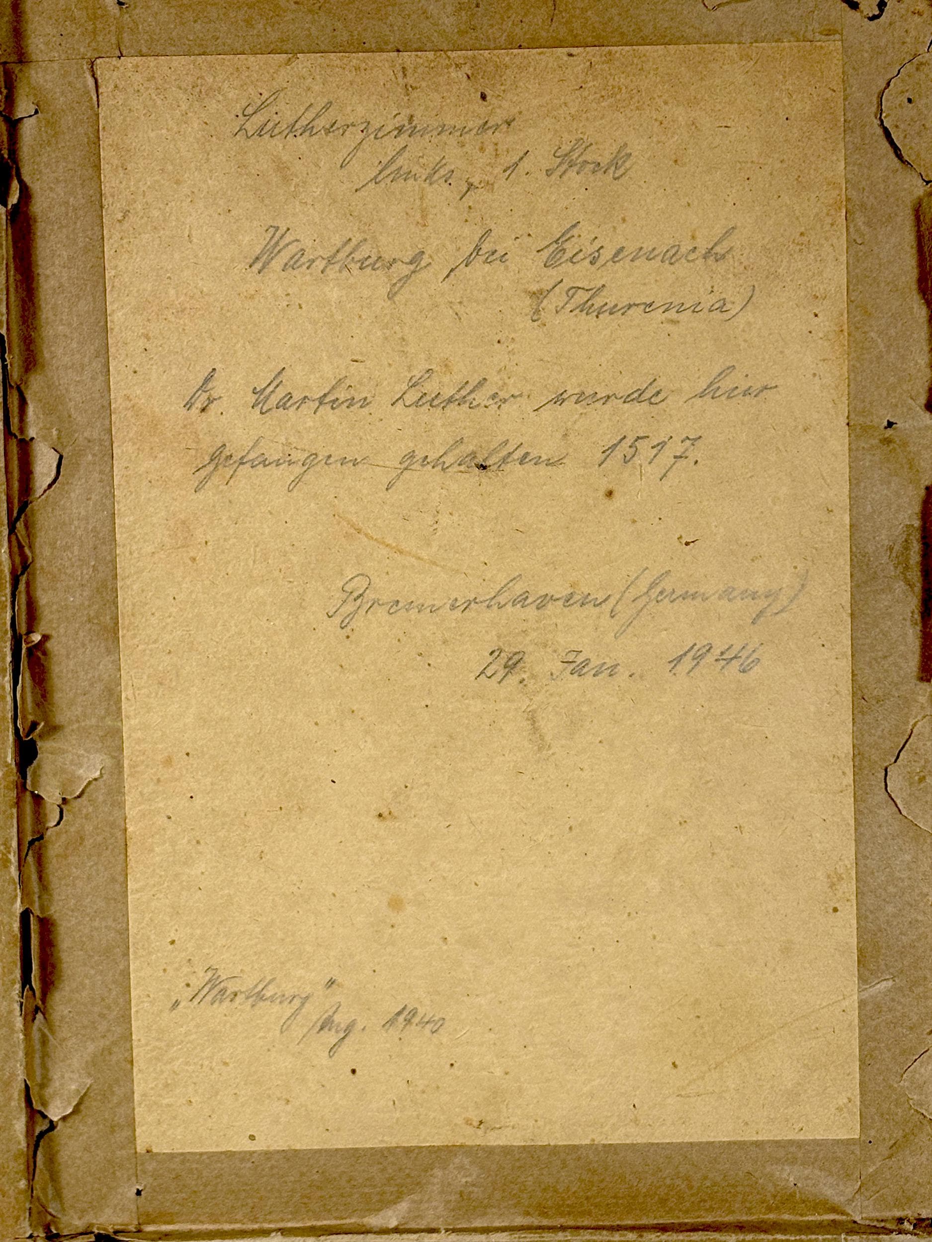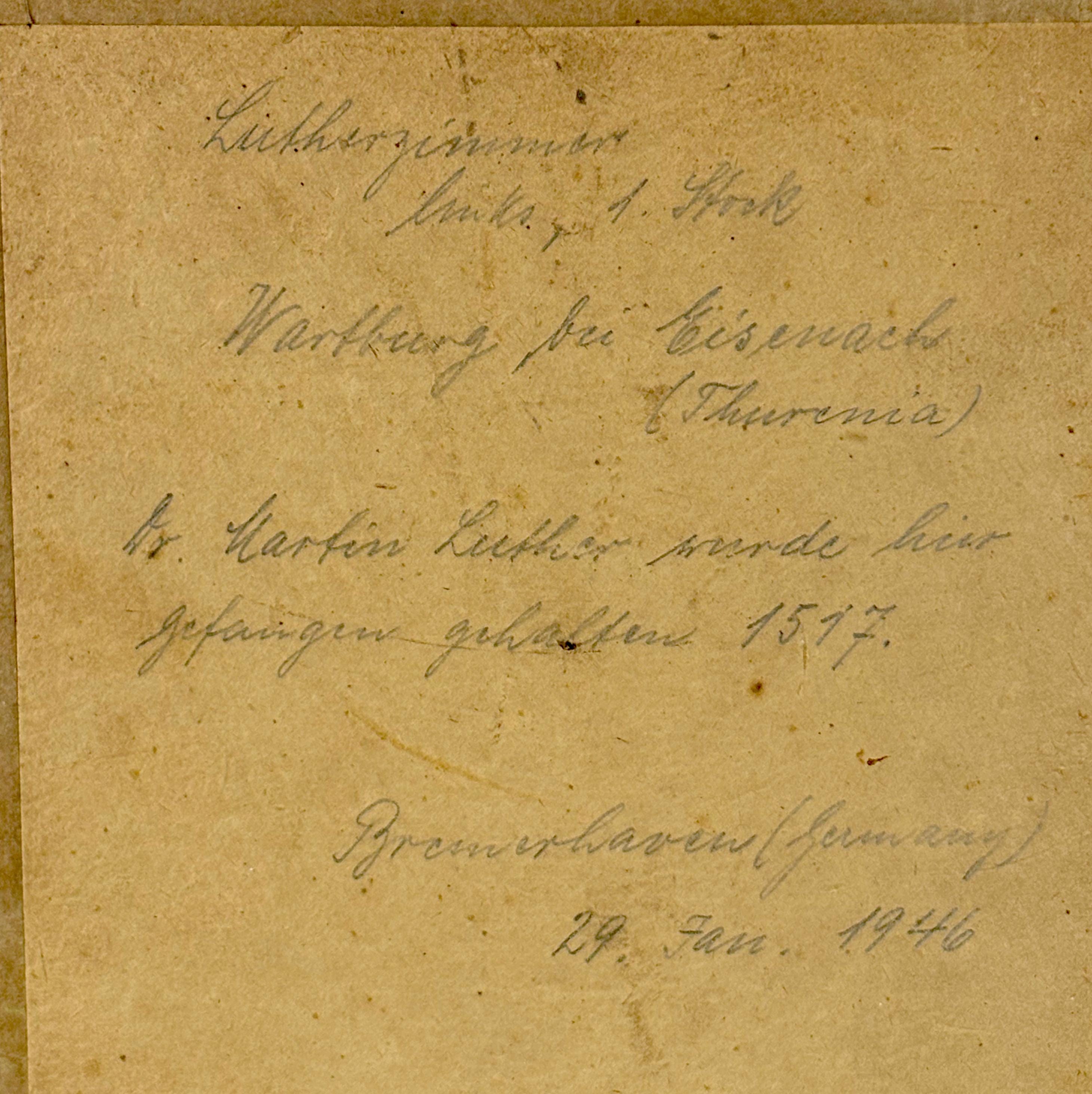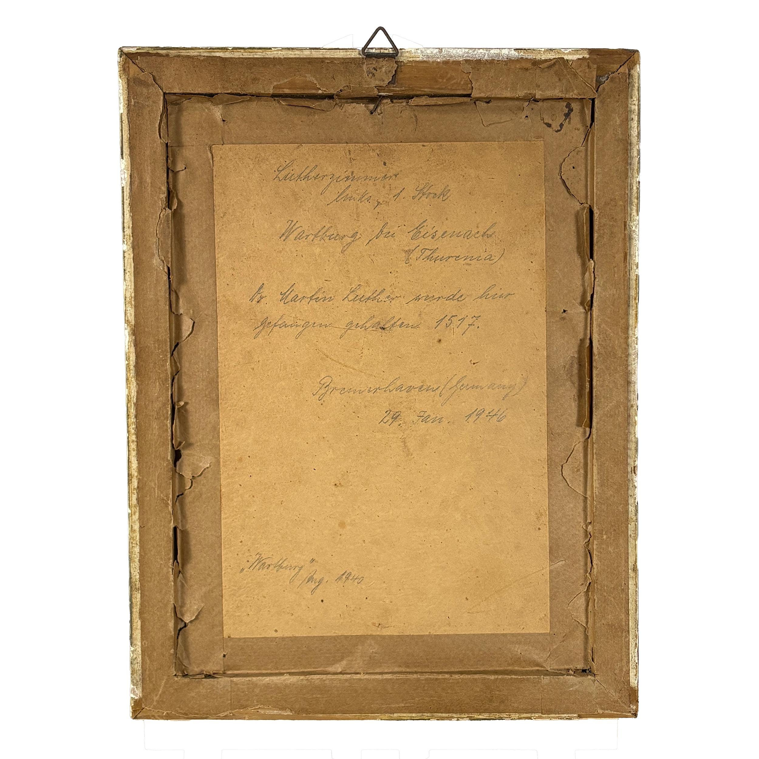 The piece measures an overall 9.5" x 12" in the frame. The board itself is about 7.5" x 10.15" with notations in German on the reverse, "Wartburg, 1940" and a note about Martin Luther having taken refuge here after exile during the reformation, presumably when gifted, dated 1946.