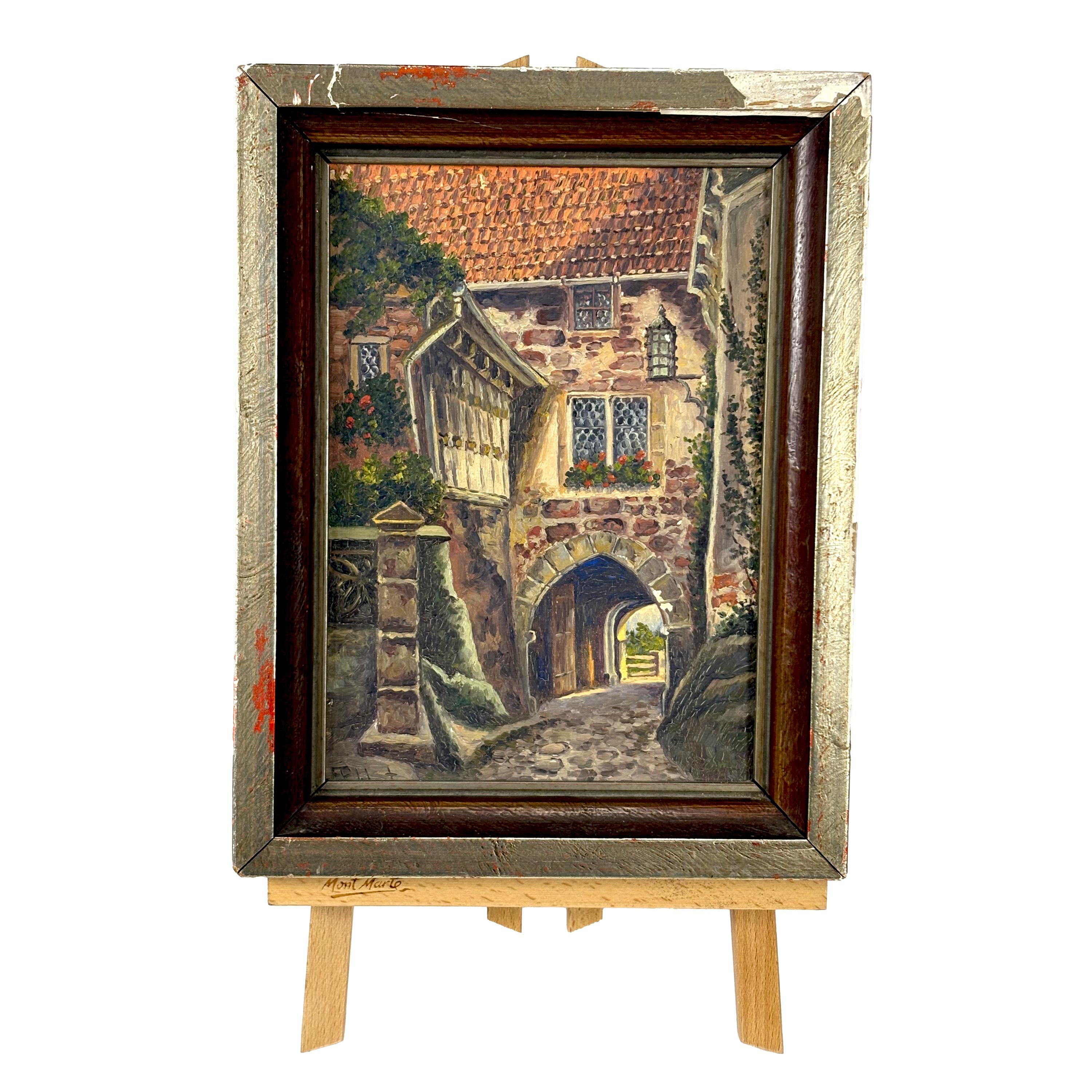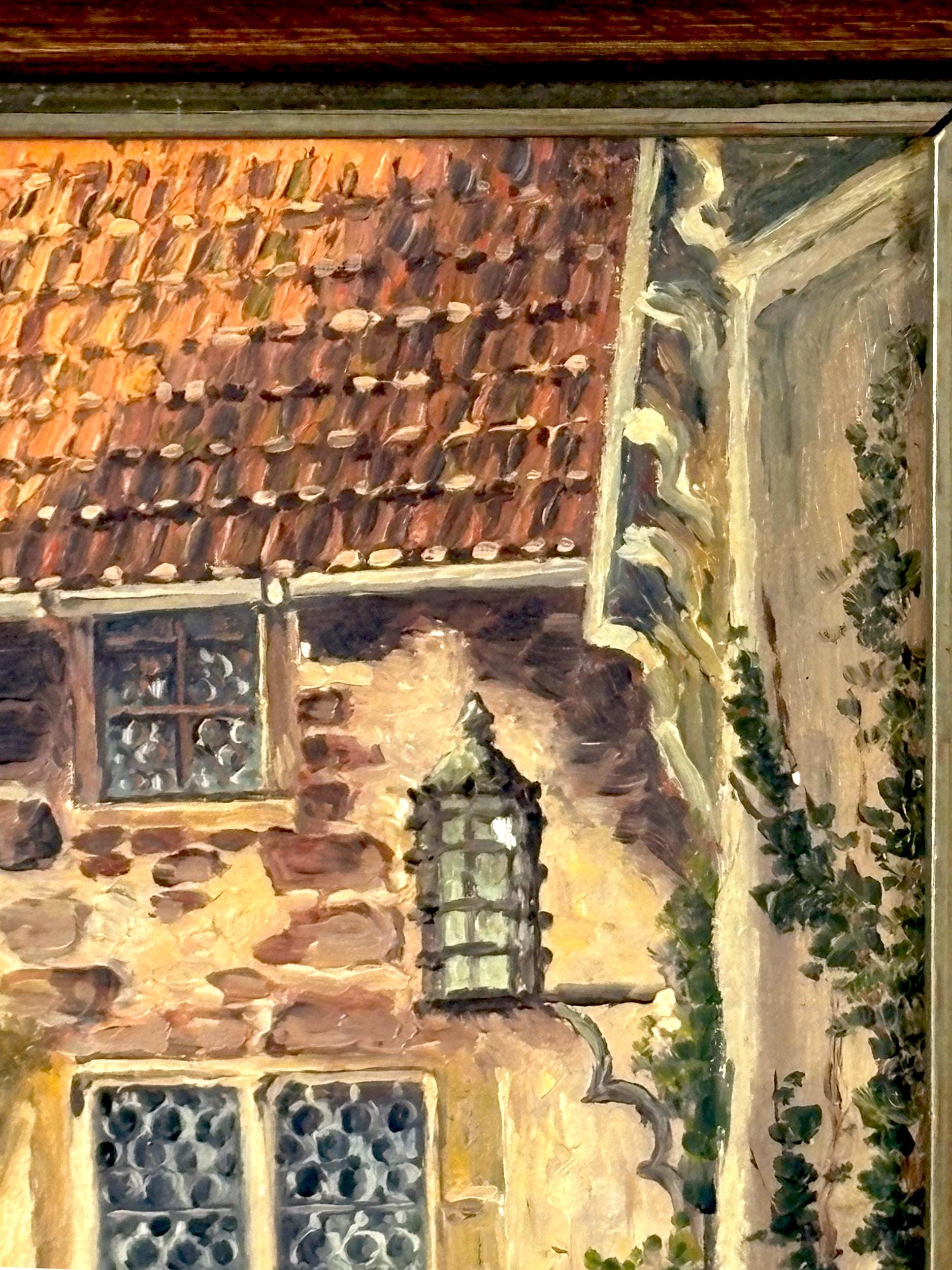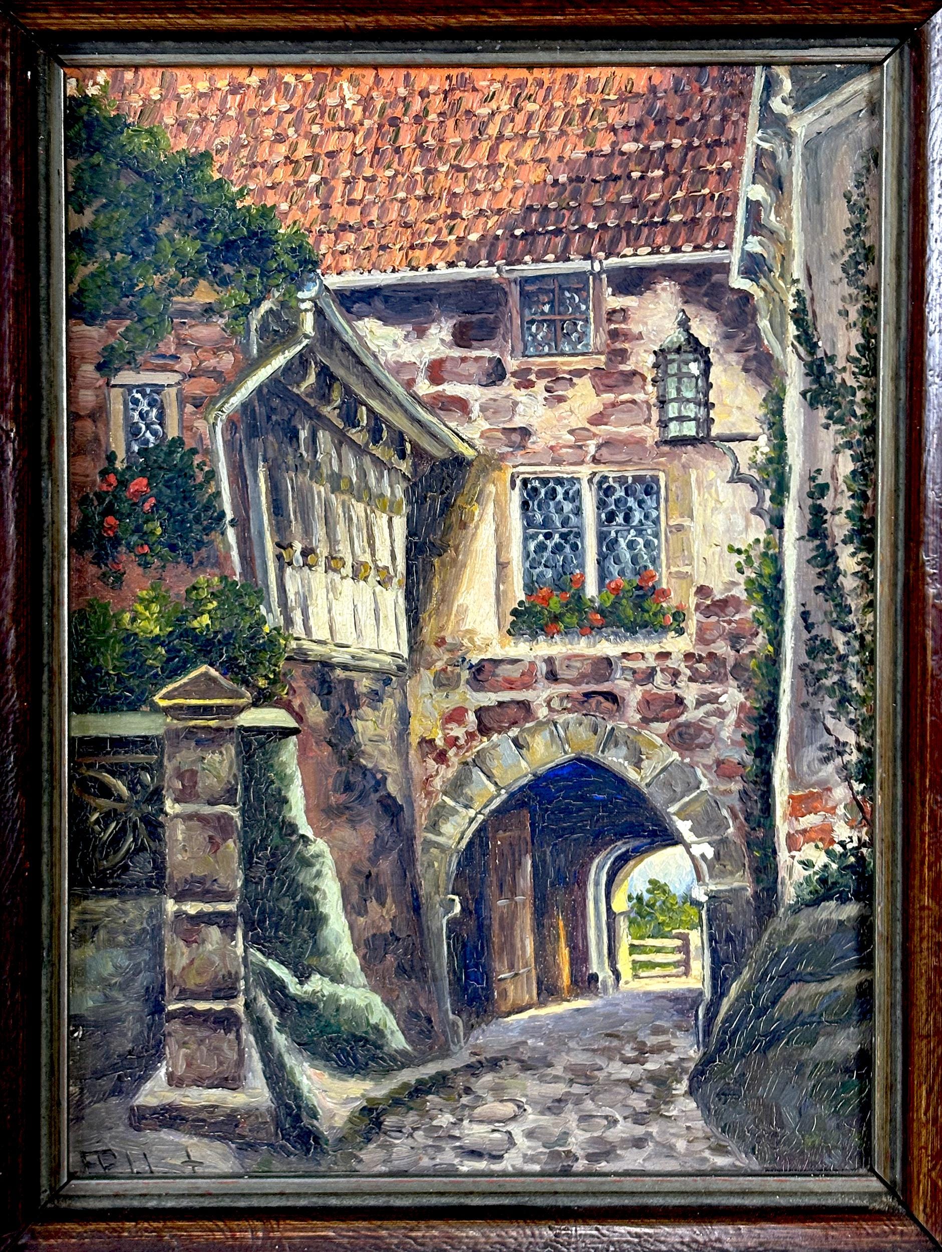 Exterior view of Martin Luther's Room at Wartburg Castle near Eisenach, Germany painted circa 1940. Original signed oil painting on board, signed in the lower left.