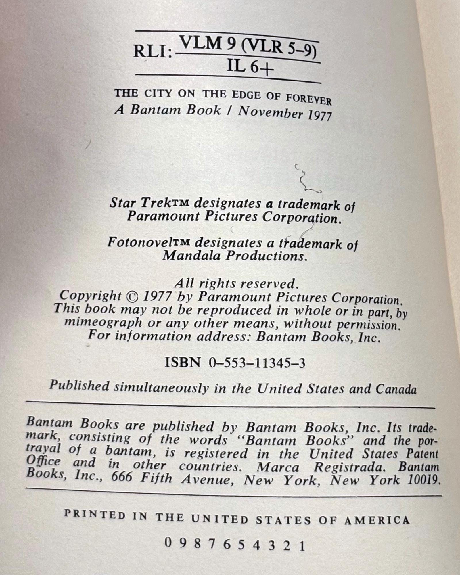 1977 first edition Star Trek Fotonovel #1: The City on the Edge of Forever paperback.